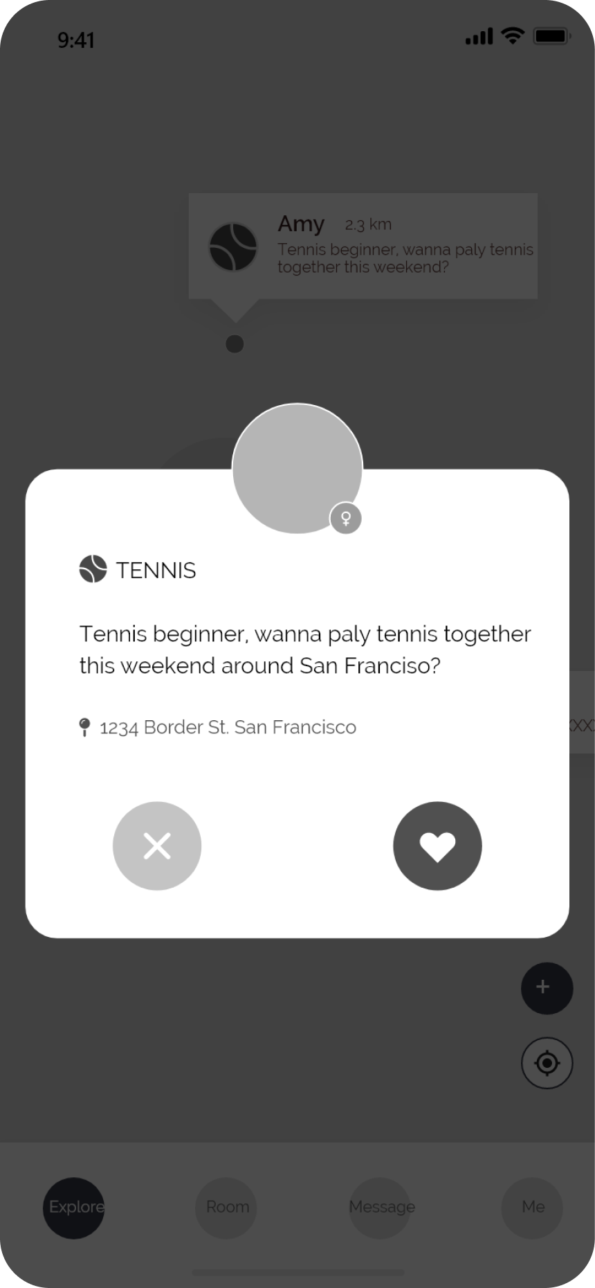 The user can post an activity request on the map by clicking the plus button, choosing the activity icon, and entering post content. The activity post with an icon will appear above the personal avatar after the user finishes posting.