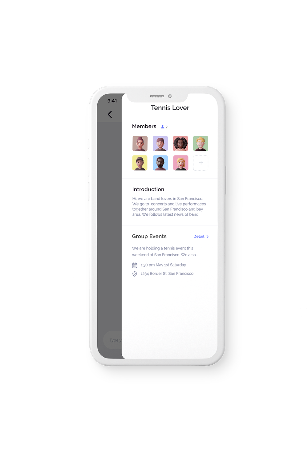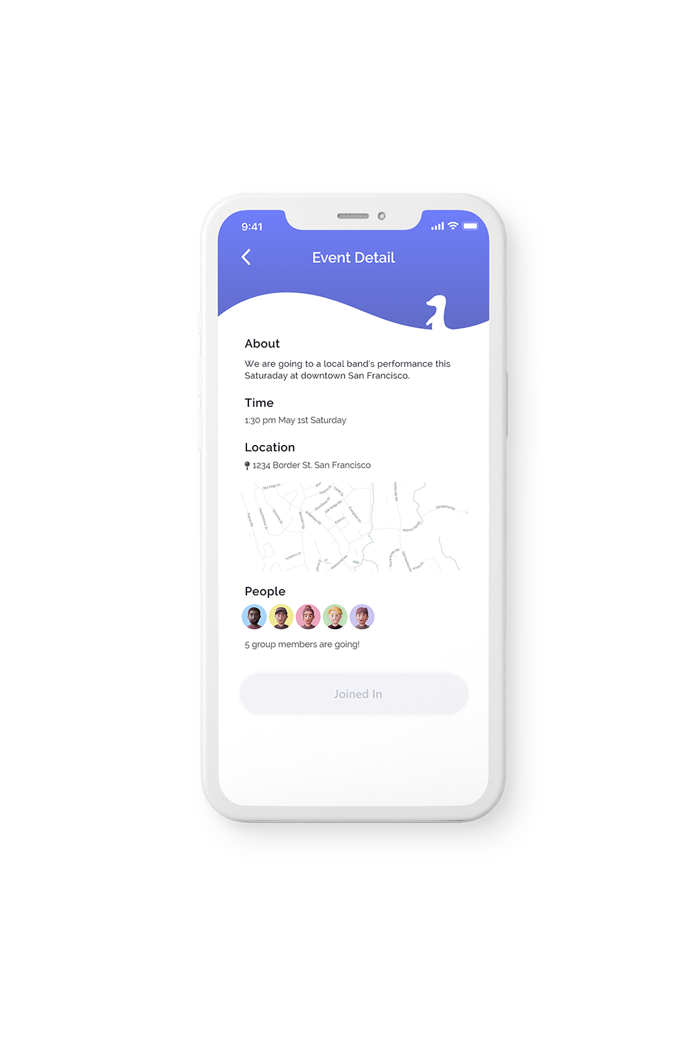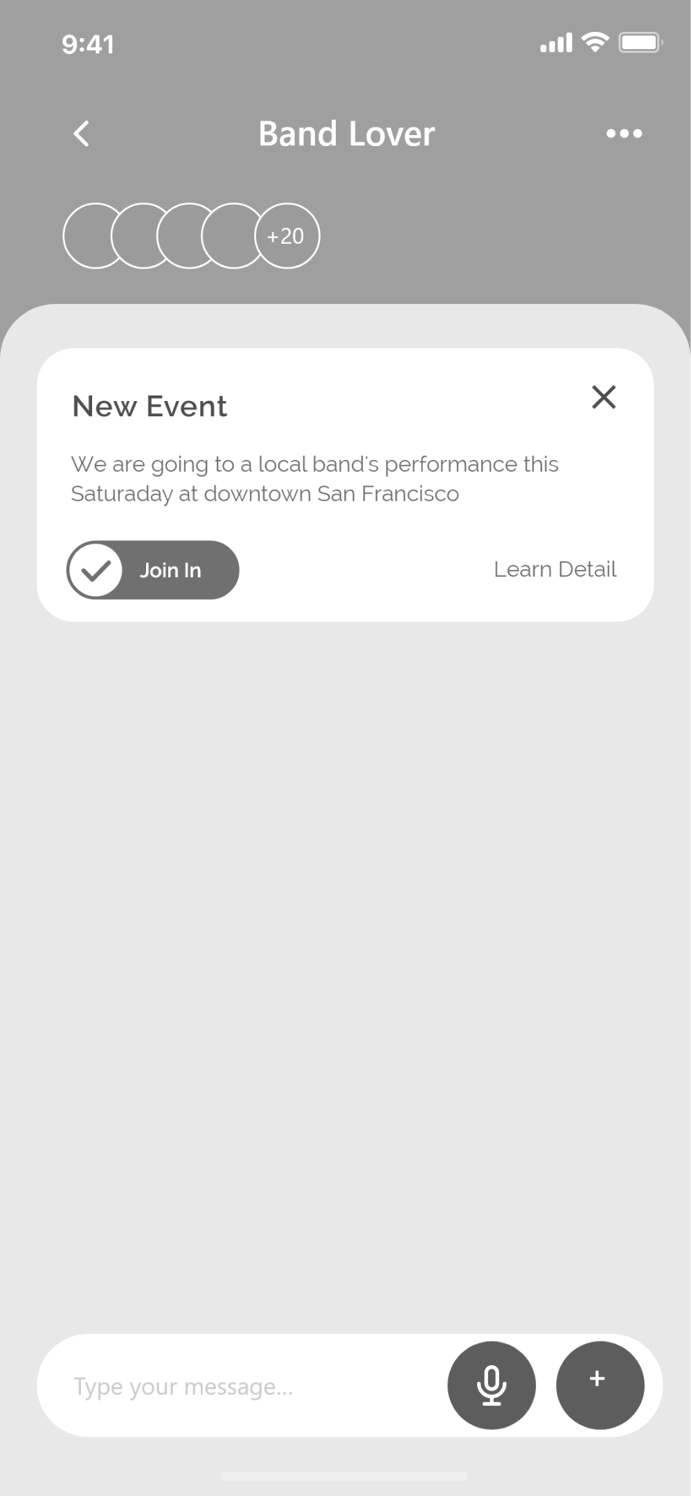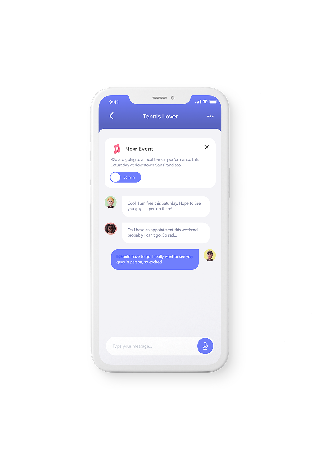 In the group section, the user can explore interest groups and communicate with other users. A closable notification appears when a new group event is posted. Group members can click the "Join In" button to indicate they are joining the event.