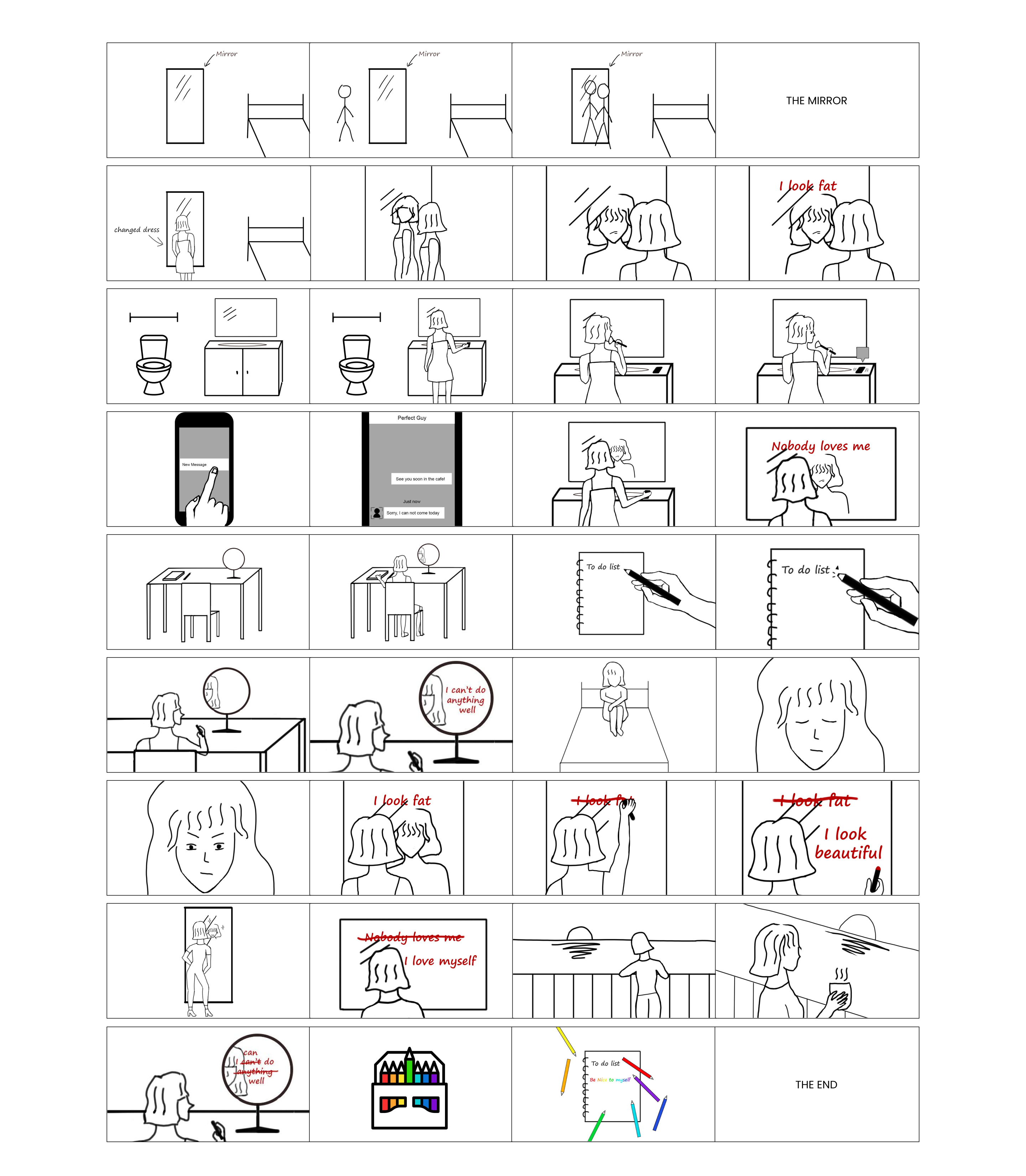 The project is to create a story and shoot a short film about self-love to make viewers think about the way they communicate with themselves and encourage the viewers to say something nice to themselves when they look in the mirror.
